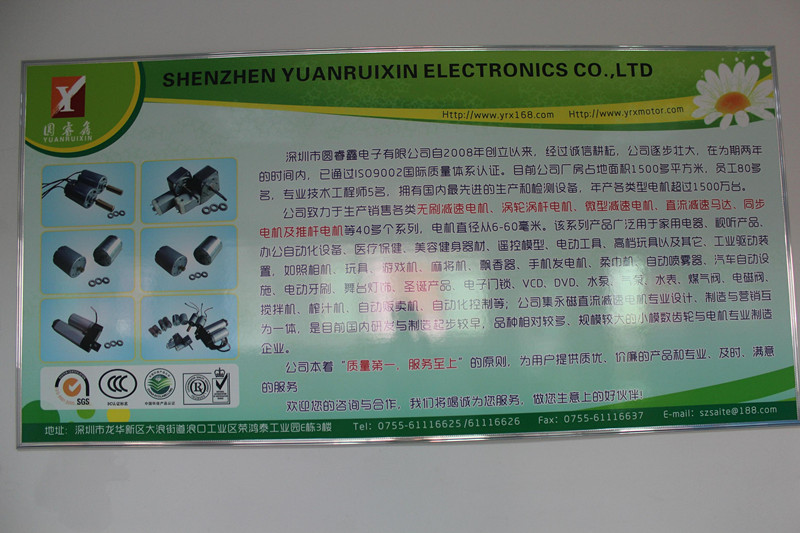 深圳市圓睿鑫電子有限公司自2008年創(chuàng)立以來,經(jīng)過誠(chéng)信耕耘,在為期兩年的時(shí)間內(nèi),已通過ISO9001:2000國(guó)際質(zhì)量體系認(rèn)證。公司廠房占地面積2000多平方米,員工100人,專業(yè)技術(shù)工程師6名,擁有國(guó)內(nèi)最先進(jìn)的生產(chǎn)和檢測(cè)設(shè)備,年產(chǎn)各類減速電機(jī)超過2~300萬(wàn)臺(tái)。因公司發(fā)展需要,于2020年底,將生產(chǎn)基地遷往擁有最美小鎮(zhèn)之稱的東莞市清溪鎮(zhèn),依山傍水,依托美麗的大自然環(huán)境和地方文化,全新的東莞市圓睿鑫電子有限公司將借助深圳母公司平臺(tái),一步步走上新的臺(tái)階。